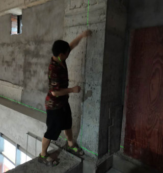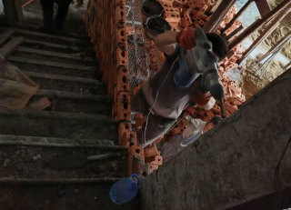 砌墙放样,开始砌墙。新旧墙体丁字交接处开槽,布置拉结筋。