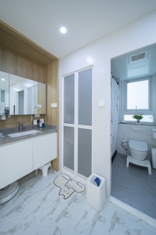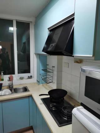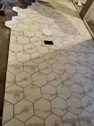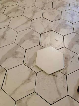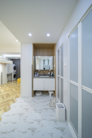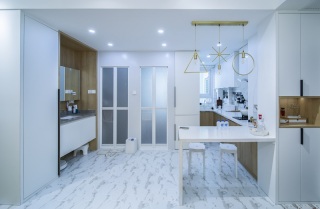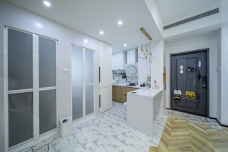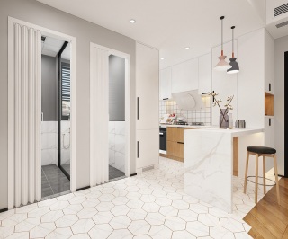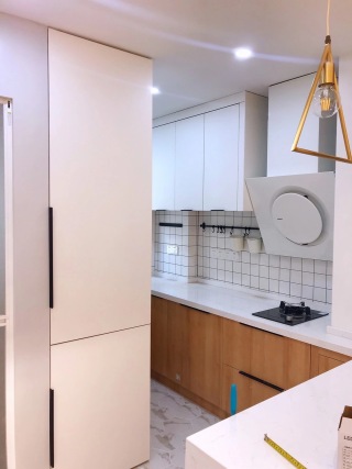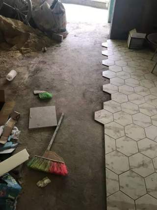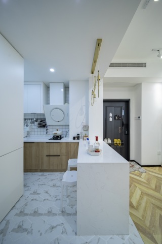 这套厨房区域地面采用最近流行的 六角砖。厨房和客厅过道采用六角瓷砖和木地板拼接工艺。